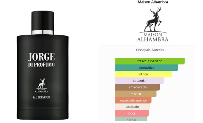 Jorge di Profumo de Maison Alhambra é um perfume Aromático Masculino. Jorge di Profumo foi lançado em 2022. As notas de topo são: Bergamota, Pimenta Preta e Limão Siciliano. As notas de coração são: Lavanda, Tabaco e Gerânio. As notas de fundo são: Sândalo, Vetiver e Almíscar.